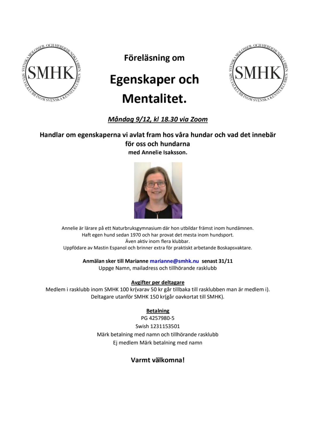 SMHK bjuder in till föreläsning om Egenskaper och mentalitet hos hund, den 9 december 18:30 via Zoom!